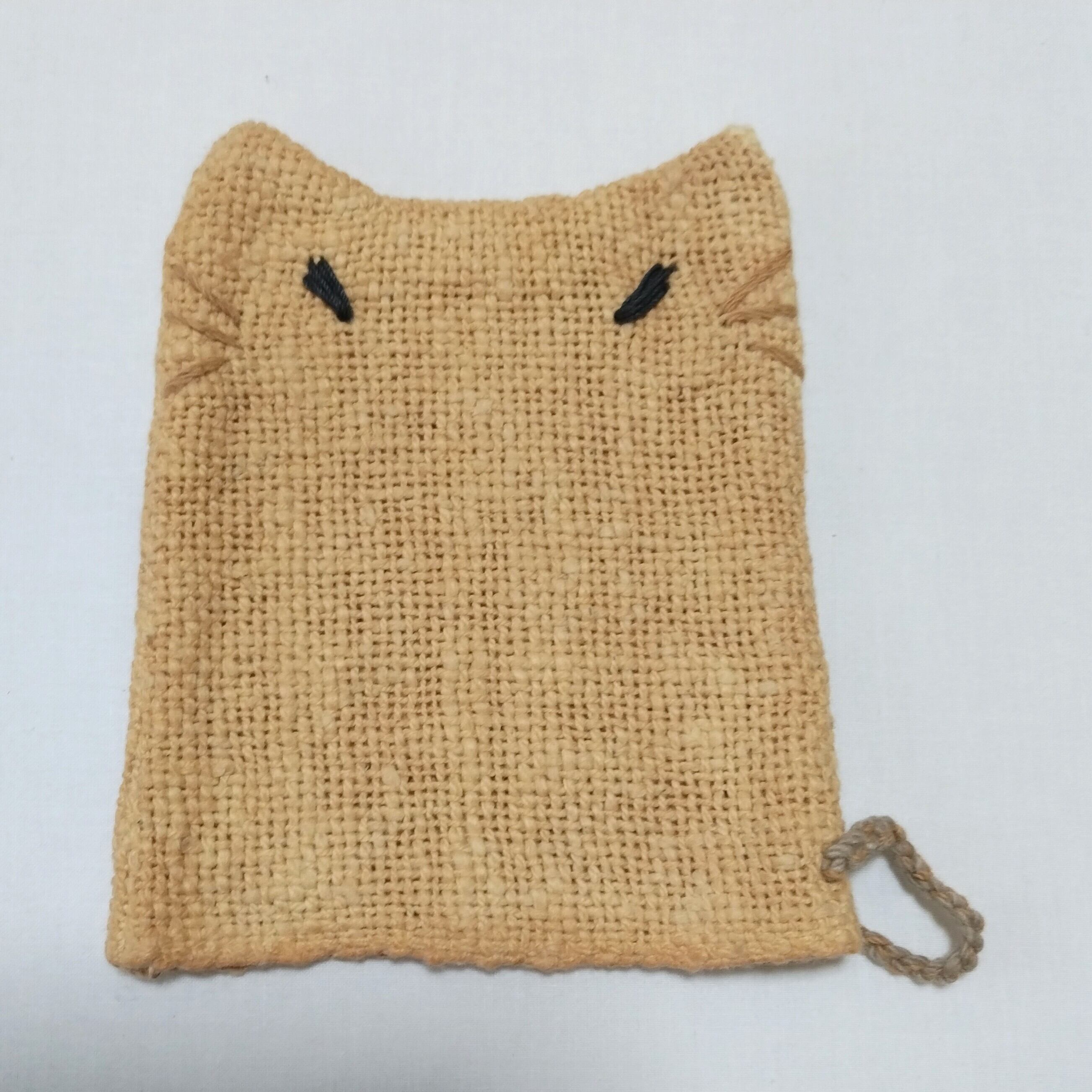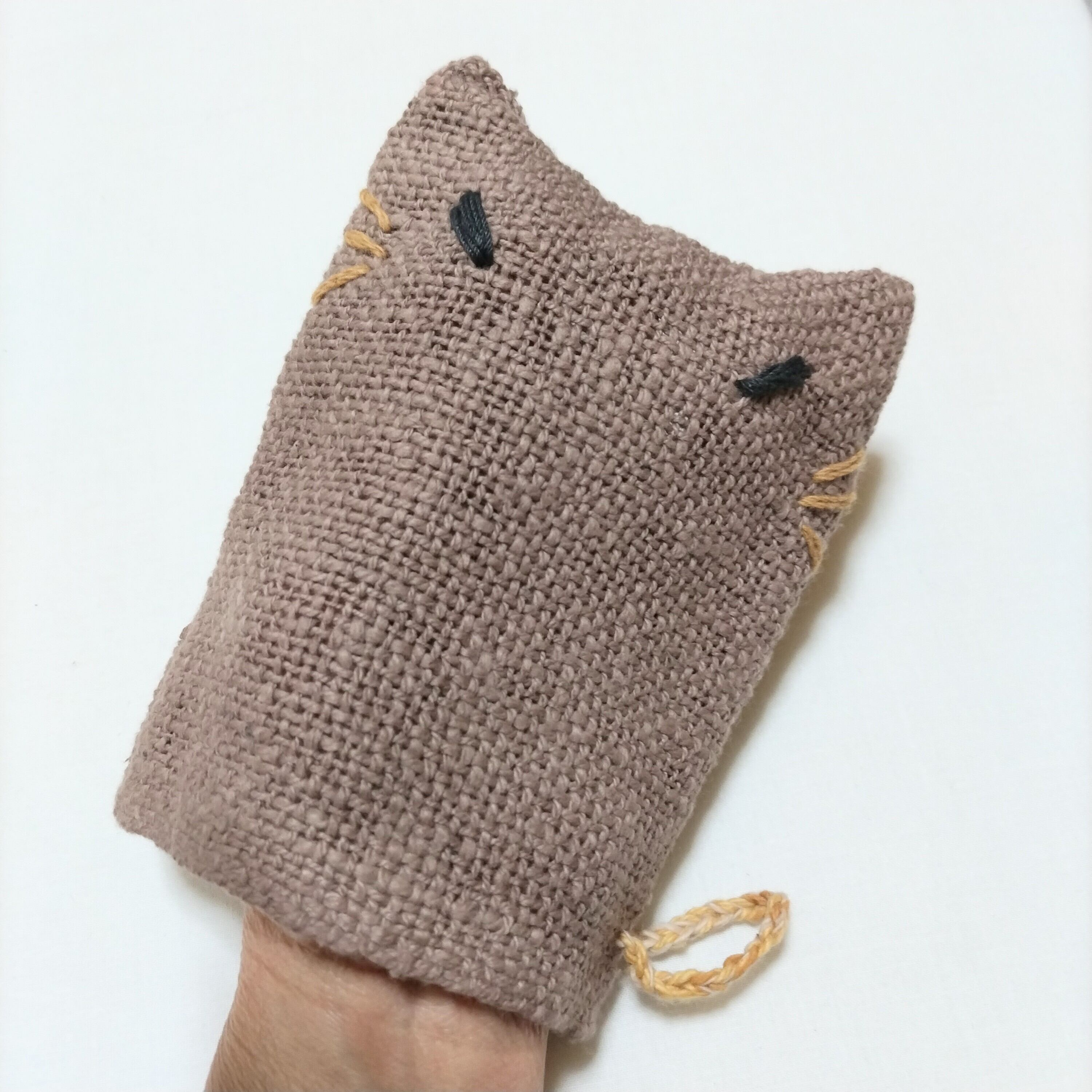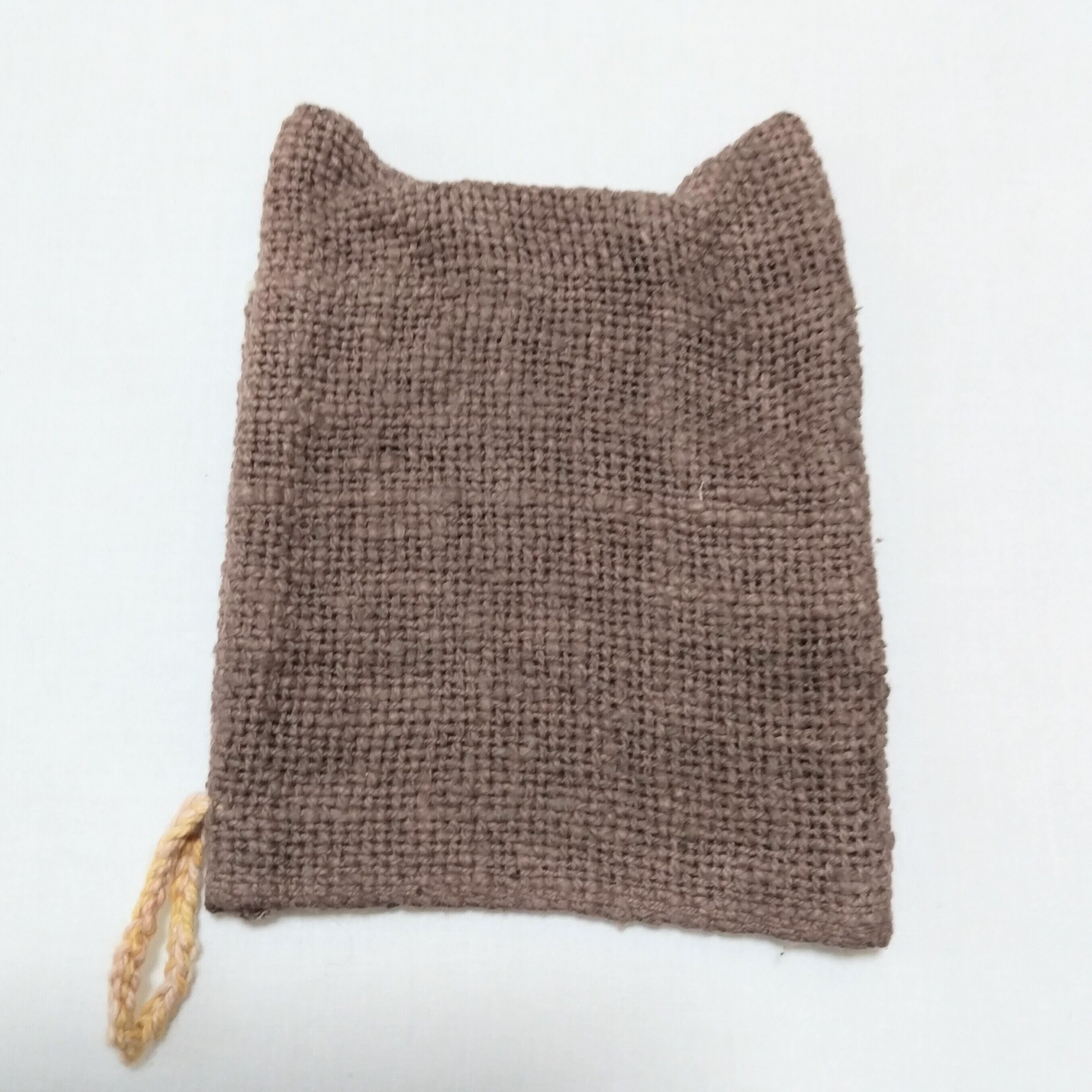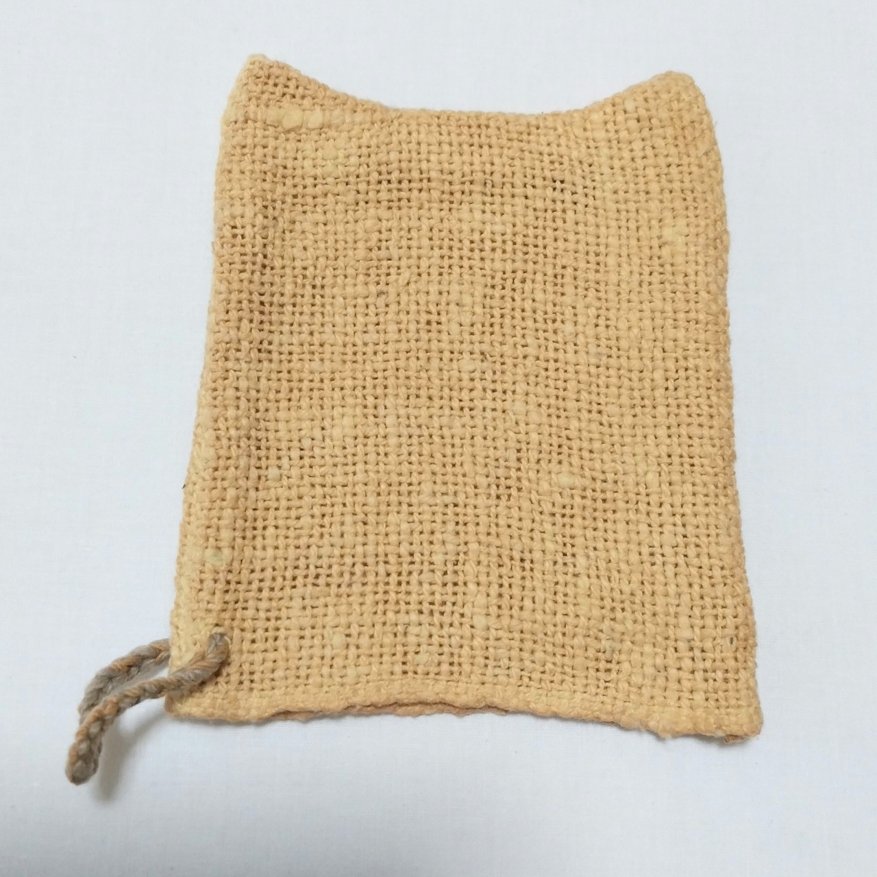 アクリルたわしのように、洗剤無しで汚れが落ちますが、このネコたわしは、がら紡綿100%を草木染めしていますので、肌にも環境にも優しい洗浄アイテムです。