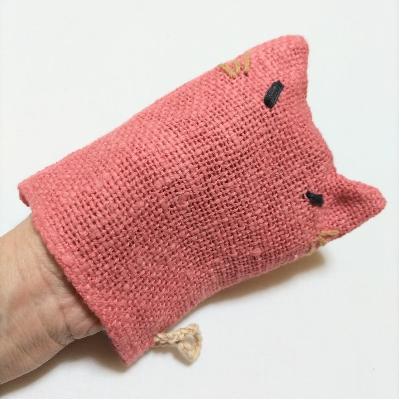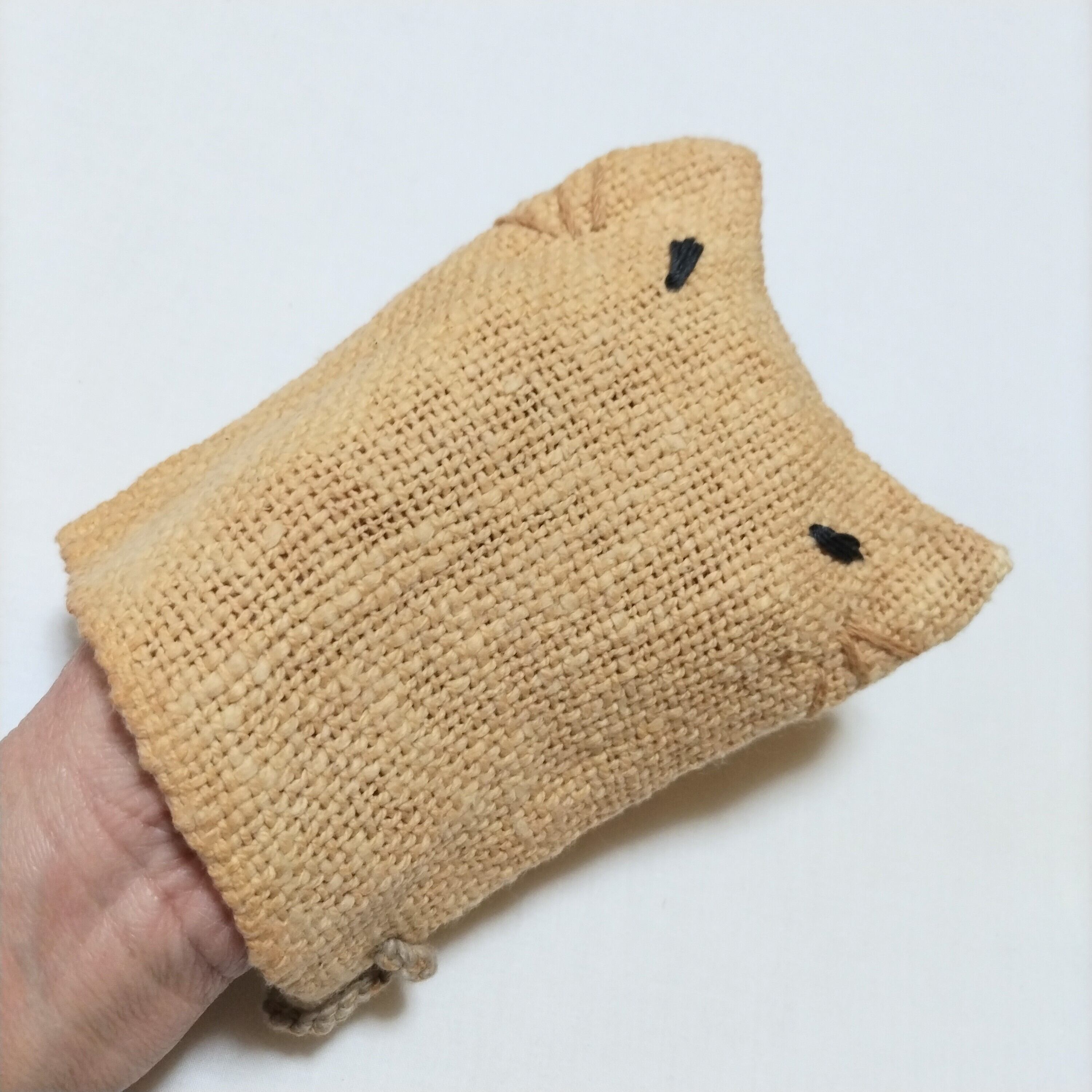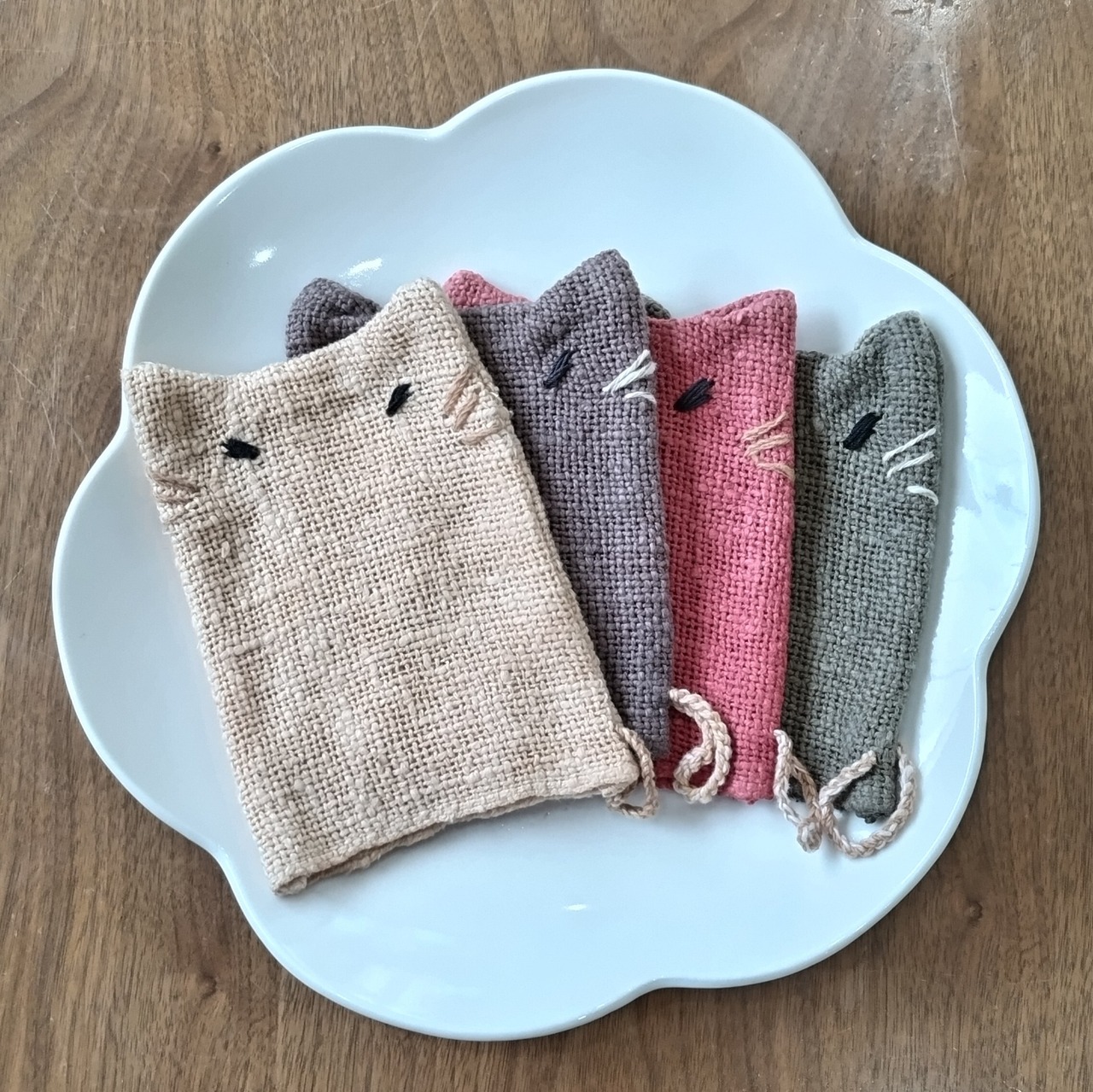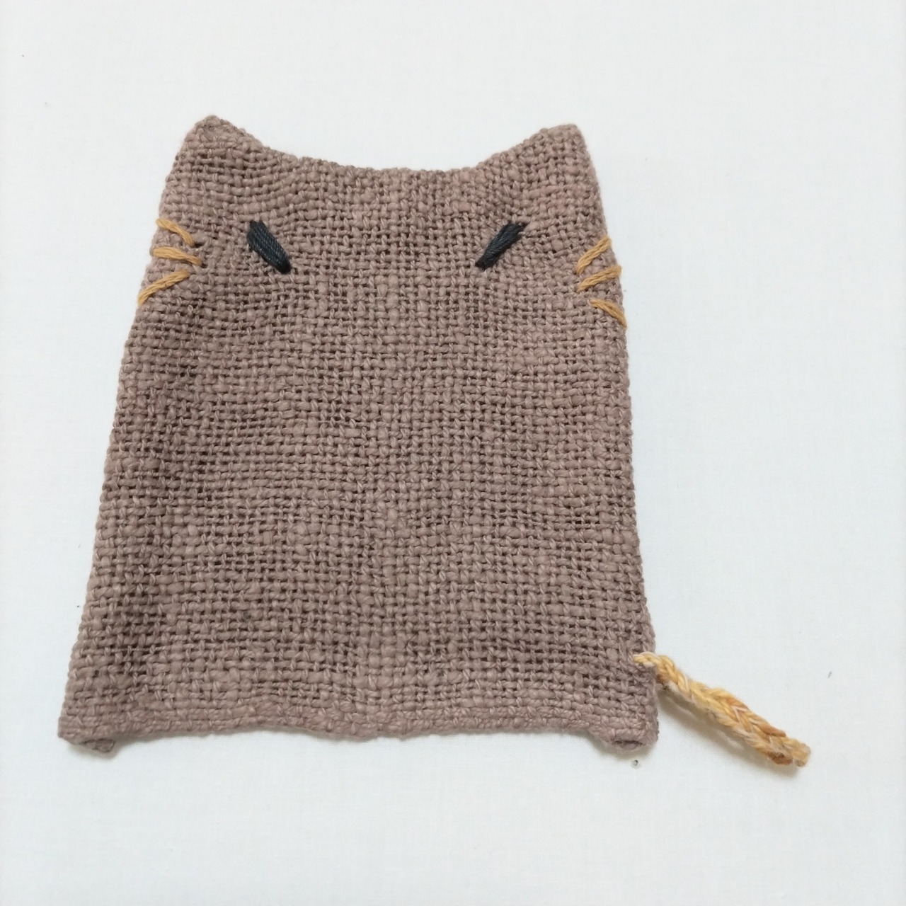アクリルたわしのように、洗剤無しで汚れが落ちますが、このネコたわしは、がら紡綿100%を草木染めしていますので、肌にも環境にも優しい洗浄アイテムです。